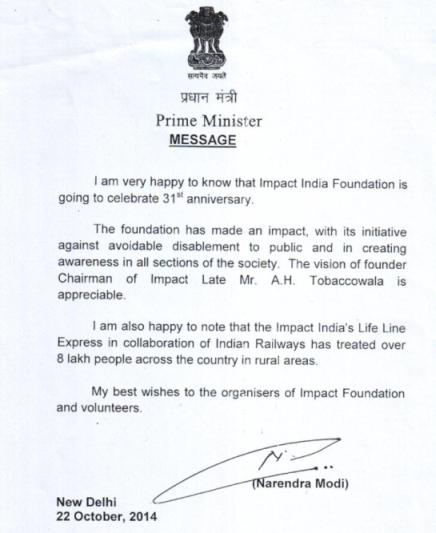 "It sounds like the Impact India Foundation is accomplishing some wonderful things. I salute you for devoting your time, talents, and energy to improving the lives of disabled children throughout India, and I send my best wishes for continued success in your important work."